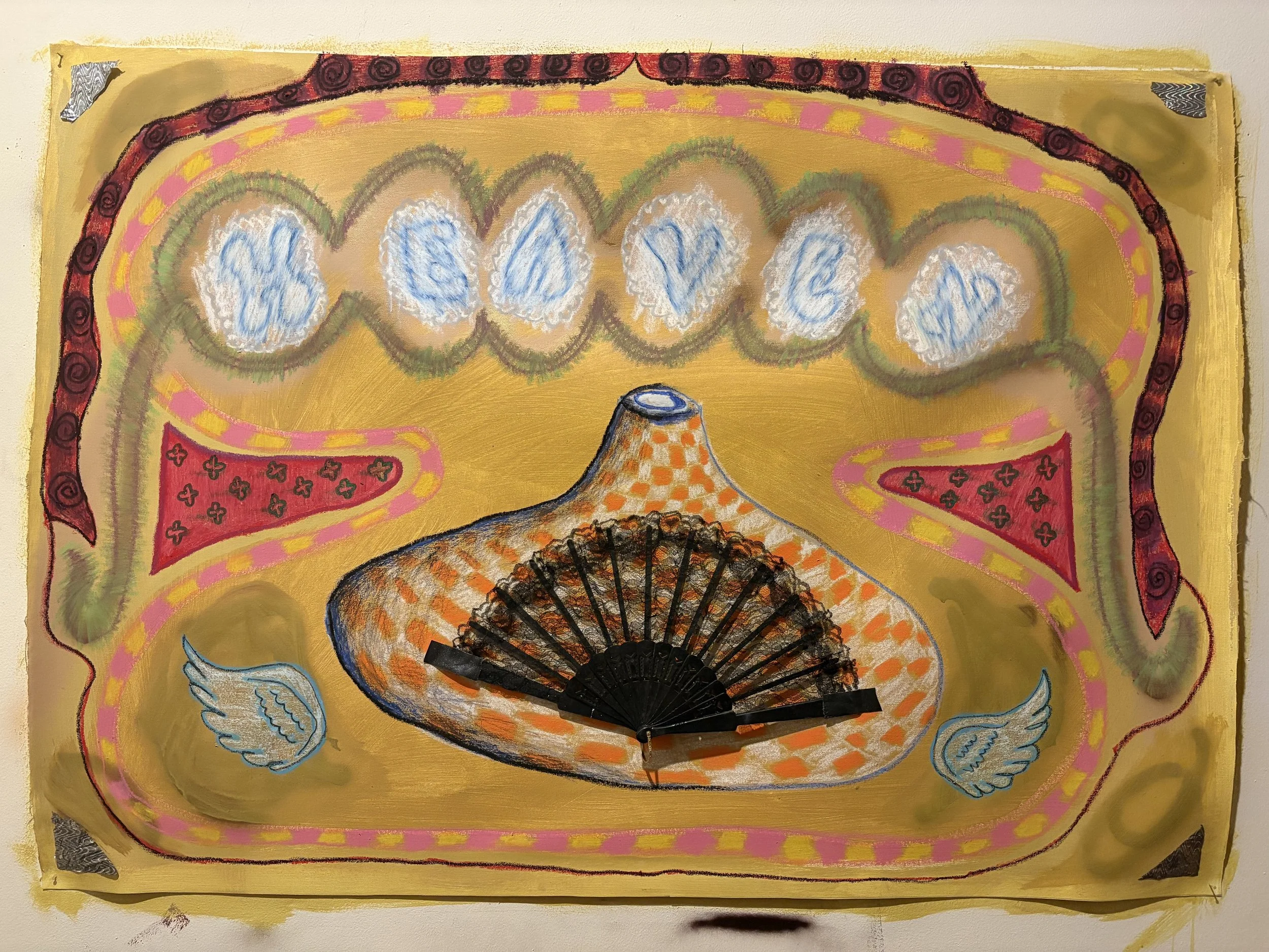 acrylic, spray paint, oil pastel, plastic, and fan on canvas