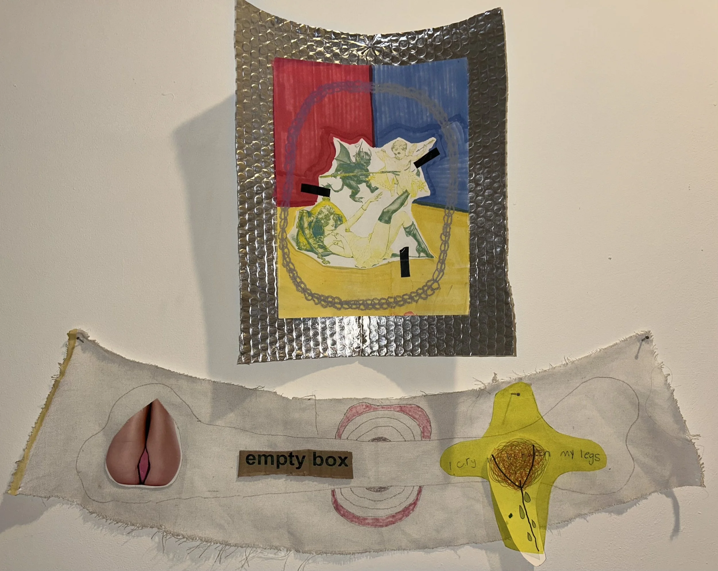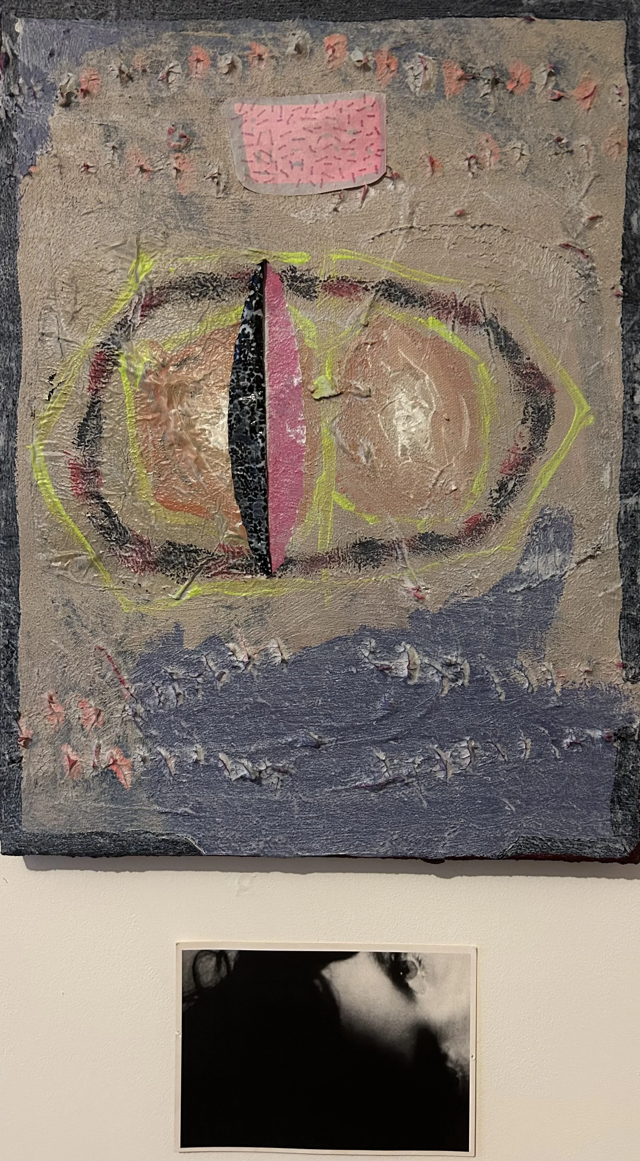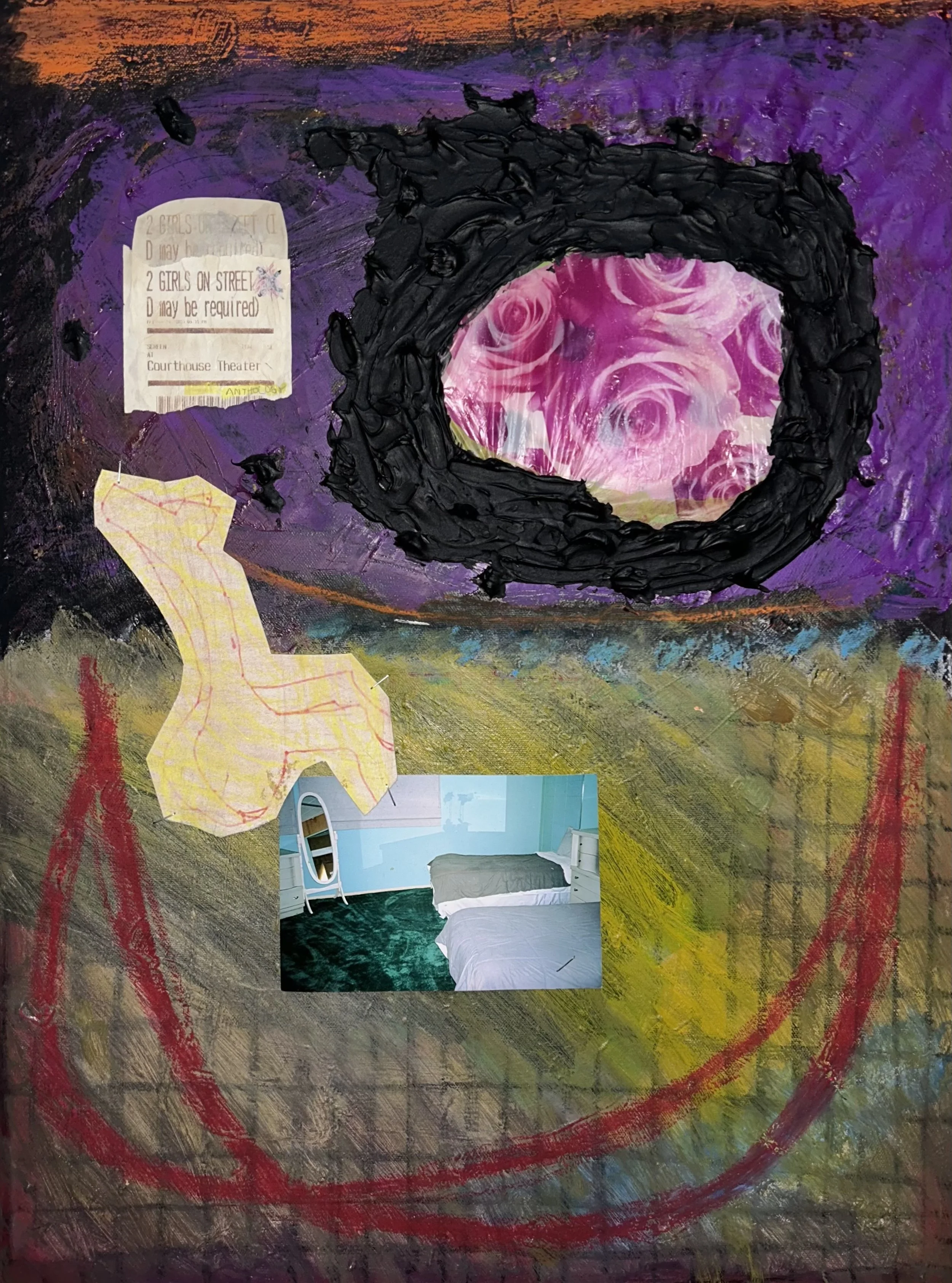 acrylic, oil pastel, plastic, movie stub, paper, photograph, and staples on canvas
