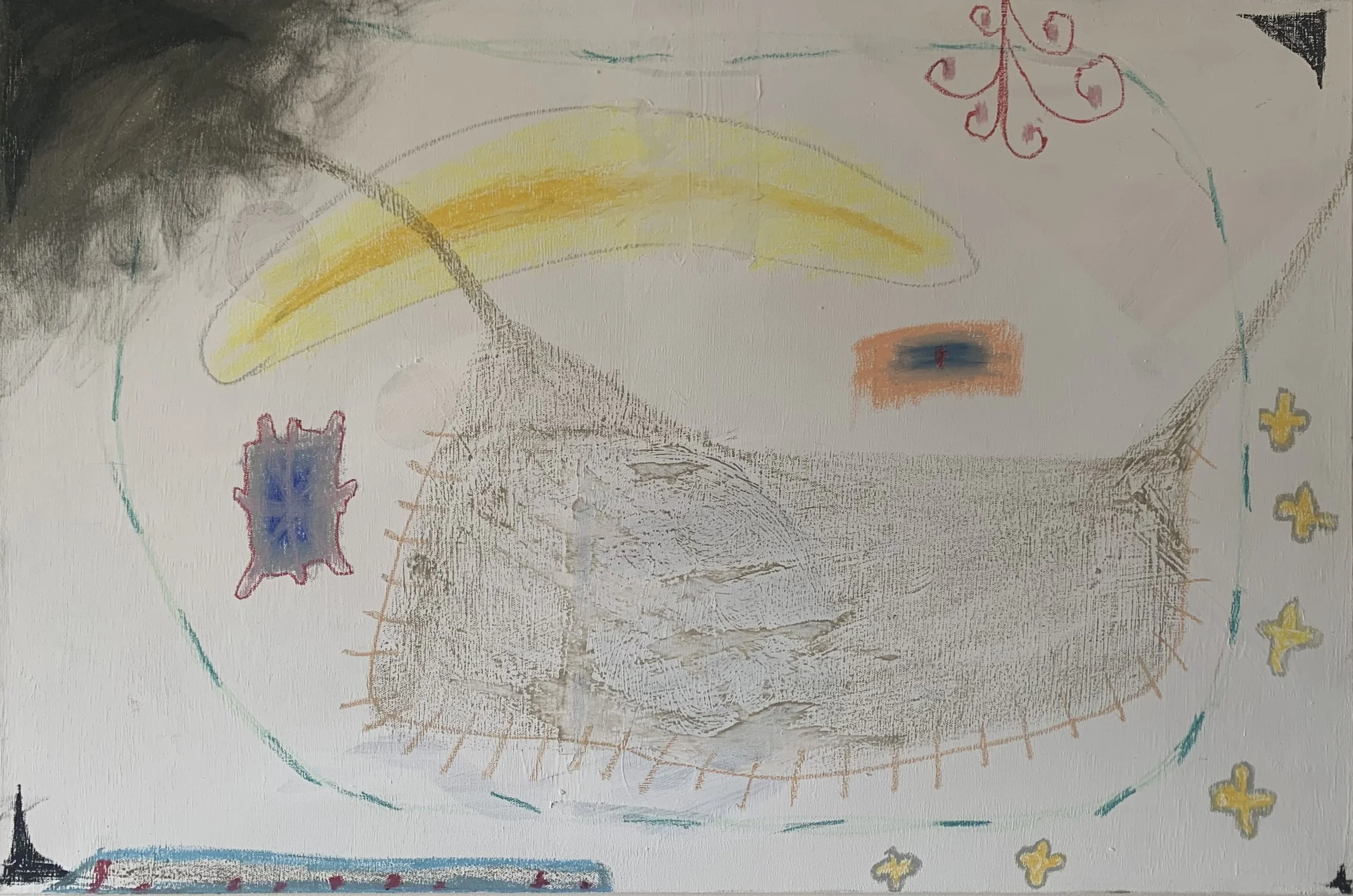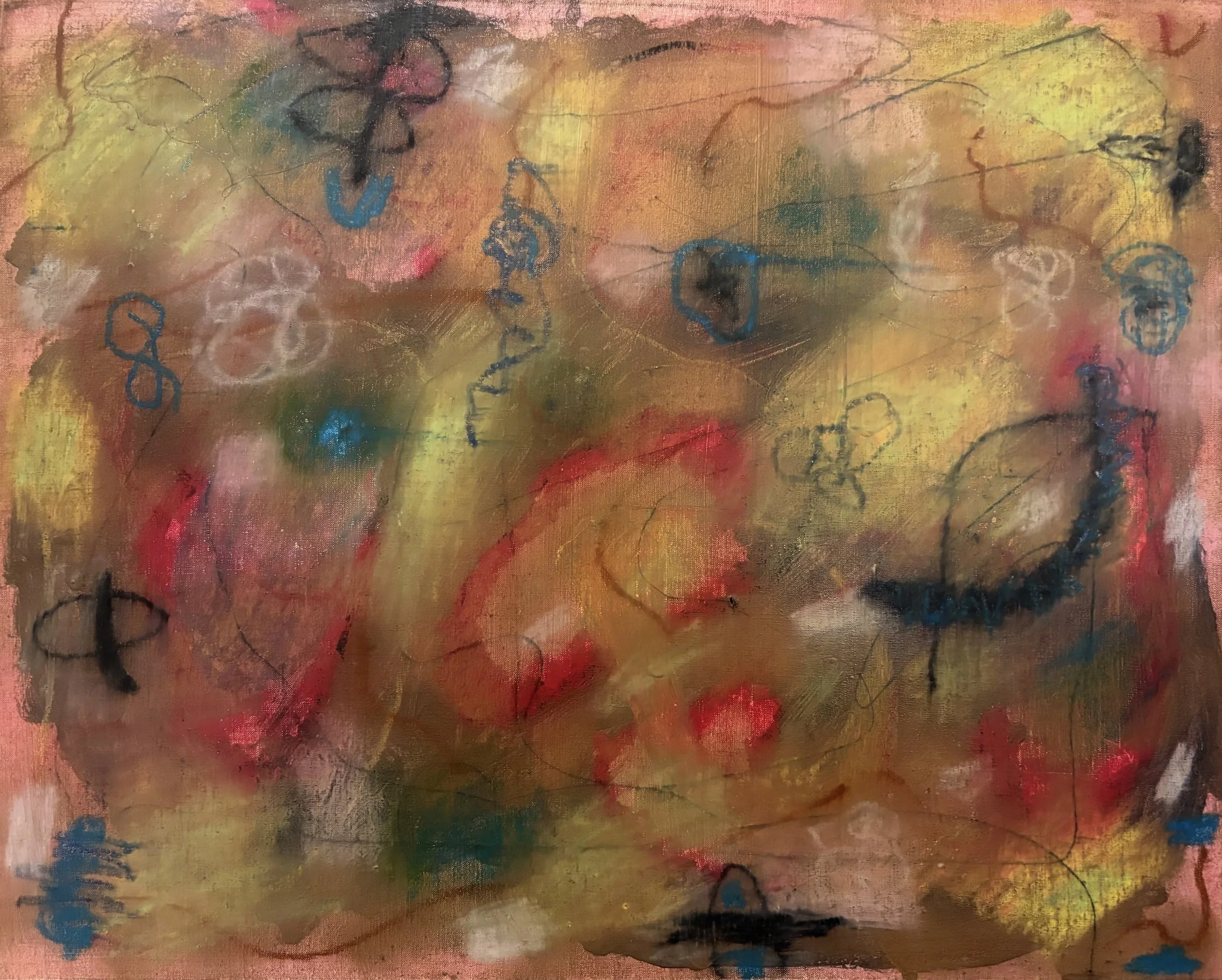 spray paint, acrylic, and oil pastel on linen over wood panel