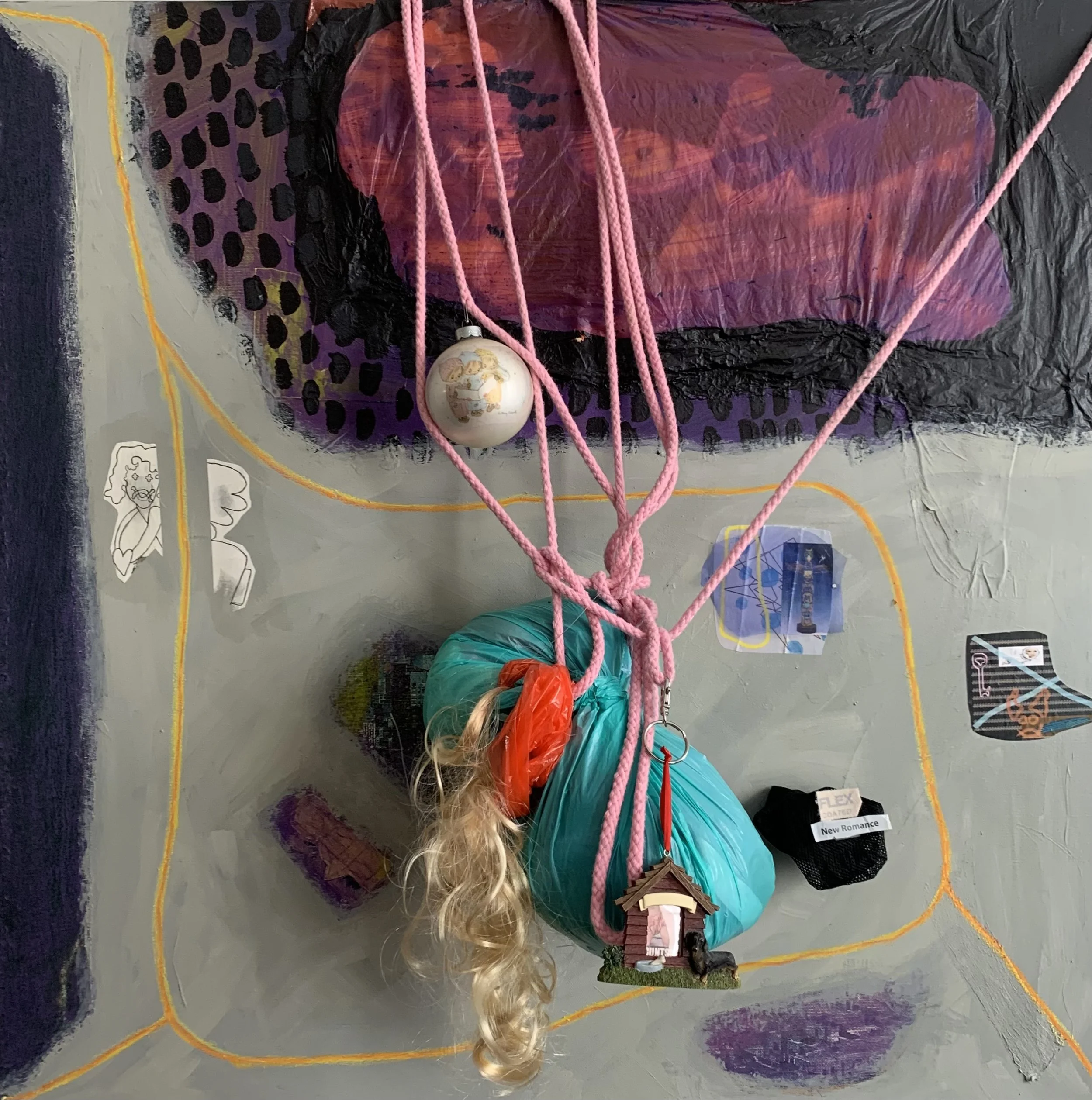 acrylic, rope, paper, plastic, wig, movie poster, ornaments, and mesh on canvas
